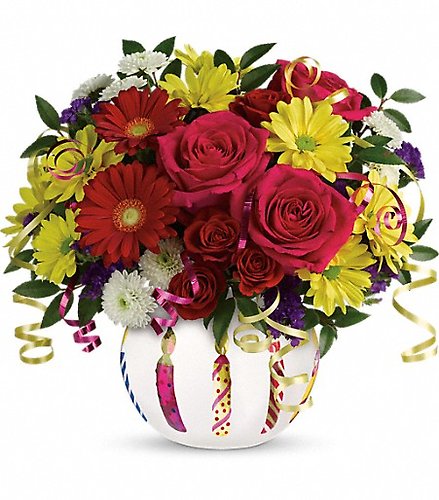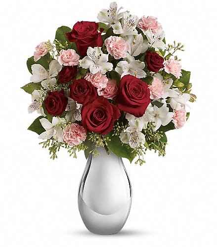 This gorgeous bouquet embodies the boundless spirit of love. Red roses, pink carnations and other romantic favorites are