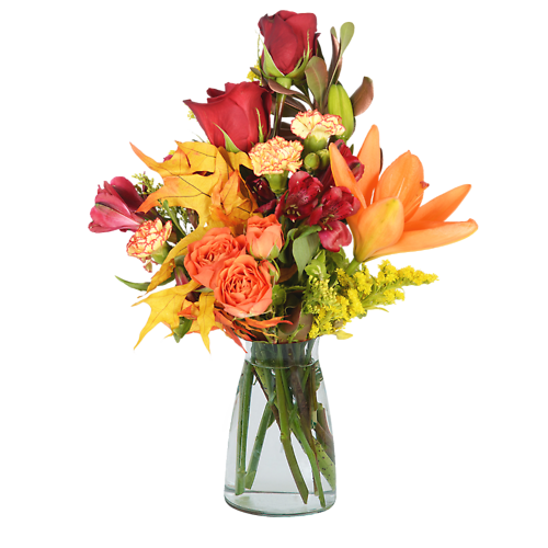 Changing leaves, crisp mornings, and warm hues. Harvest Sunrise will bring the warmth of the season. A clear glass vase