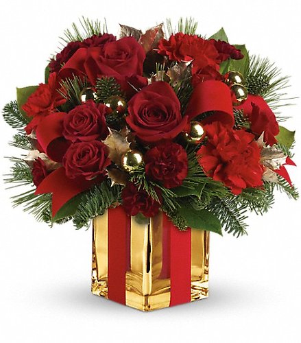 Lush red roses, fresh winter greens and a festive, gold mirrored glass cube are all wrapped up with red ribbon for an el