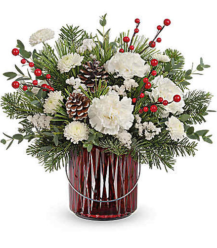 Celebrate the season with Teleflora's Snowy Pines Centerpiece. Bursting with red and white blooms in Teleflora's foodsaf